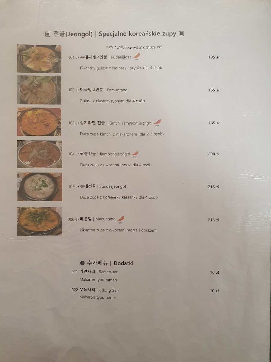 For poultry lovers, the Ganjang Dakgalbi offers chicken marinated in soy sauce and garlic, also served with rice and miso soup, for PLN 47.00. Soup enthusiasts will delight in the Chadol Sundubu Jjigae, a comforting stew featuring tender tofu and beef, or try the spicy Kimchi Jjigae, both for PLN 47.00 and PLN 43.00 respectively.